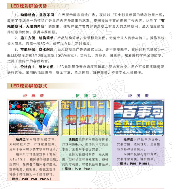 戶外廣告產(chǎn)品——LED炫彩屏、噴繪屏。該產(chǎn)品以持久耐用、安裝方便、效果新穎、價位適中的特點,得到業(yè)內(nèi)人士的一致好評。LED炫彩屏、噴繪屏普遍應(yīng)用于戶外廣告、大型門頭及舞臺背景等。