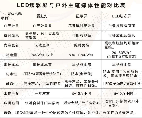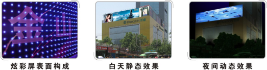 炫彩屏集合了噴繪廣告和LED顯示屏的特點,取二者之長,既具有噴繪廣告低成本優(yōu)勢,又可以顯示動感畫面,白天一幅畫,夜間一塊屏。獨特的灰度調(diào)整、亮度控制、伽瑪校正等多項先進(jìn)的顯示控制技術(shù),與其它戶外顯示媒體(三面翻廣告、霓虹燈廣告等)相比具有更強的視覺沖擊力。并且利用視頻成像技術(shù)將人的視覺系統(tǒng)與大腦連接起來,使之呈現(xiàn)動感細(xì)膩流暢的視頻圖像。適合戶外全天候各種復(fù)雜環(huán)境,安裝方便且性價比高,是當(dāng)前戶外廣告媒體的新選擇。