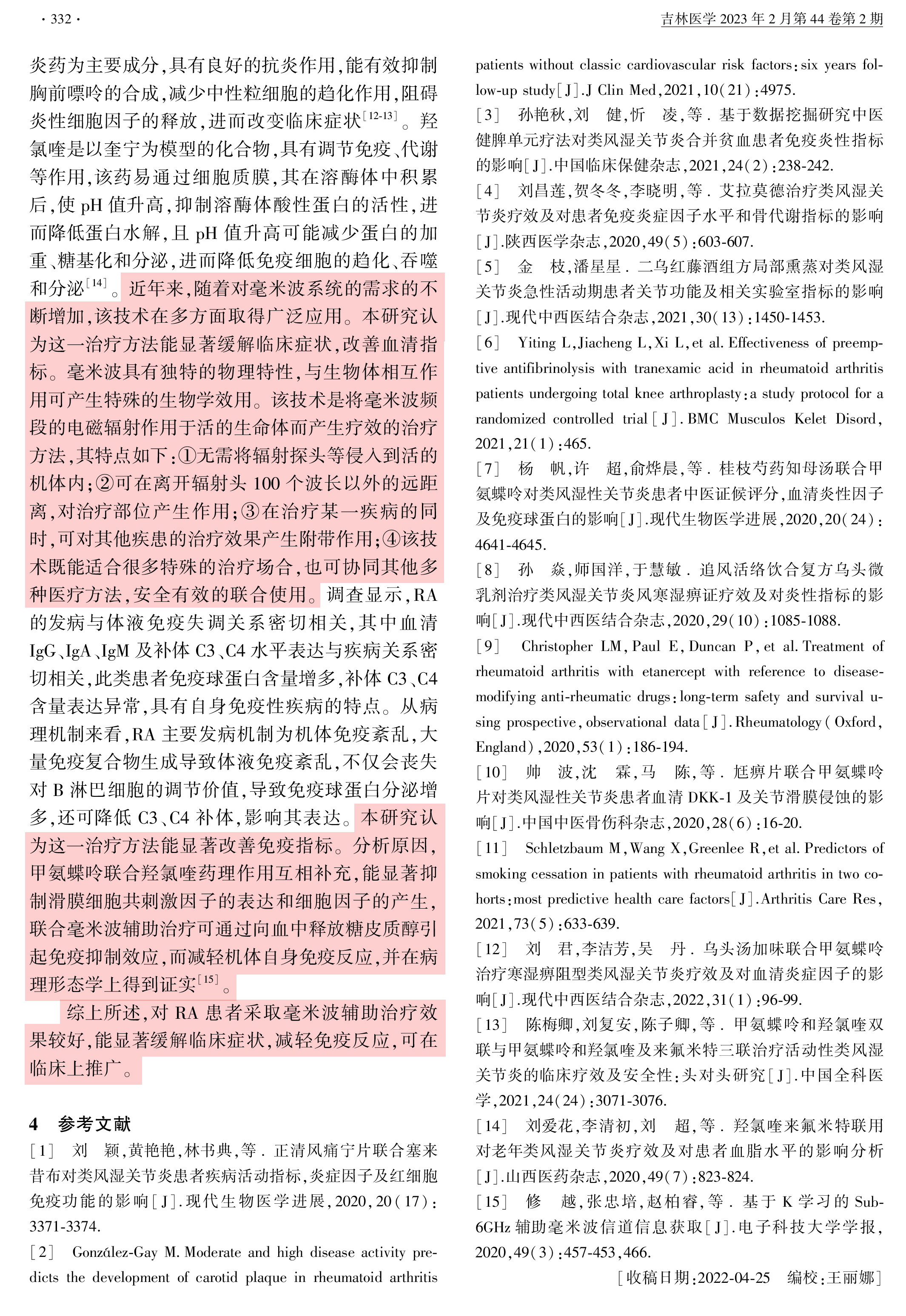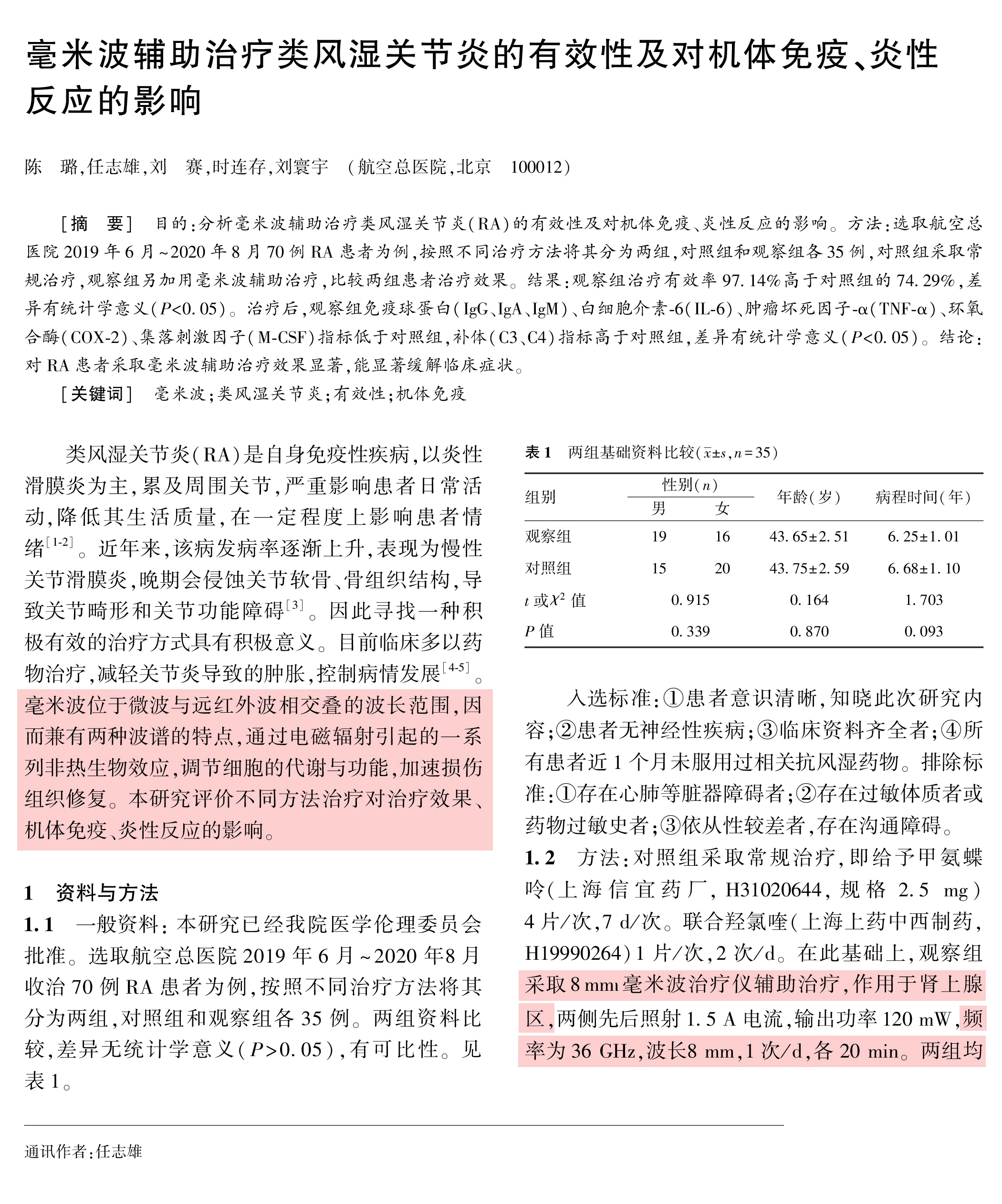 毫米波輔助治療類風(fēng)濕關(guān)節(jié)炎的有效性及對機(jī)體免疫、炎性反應(yīng)的影響
